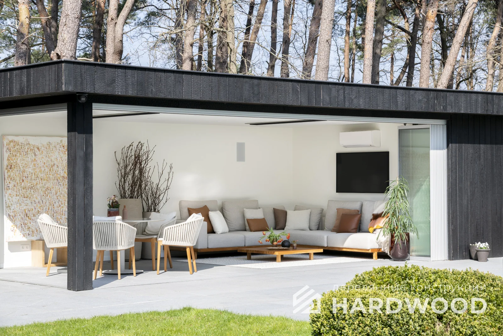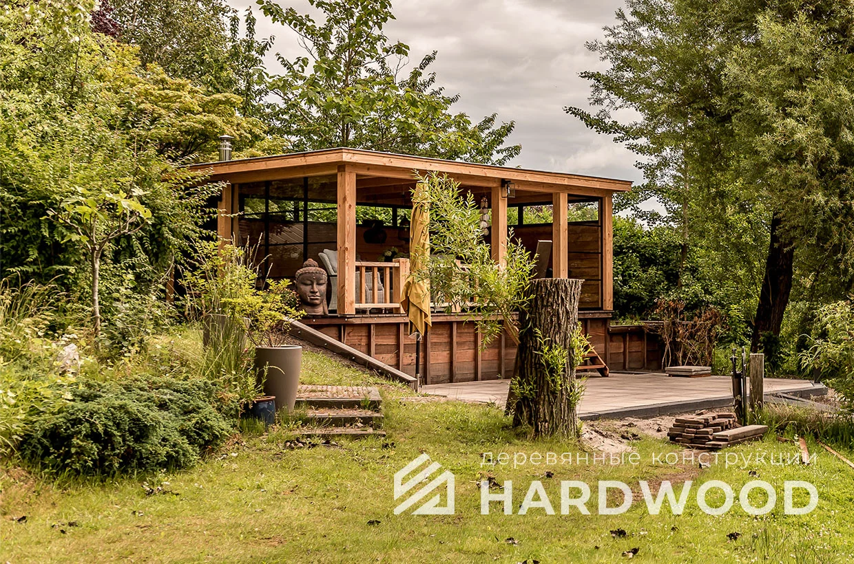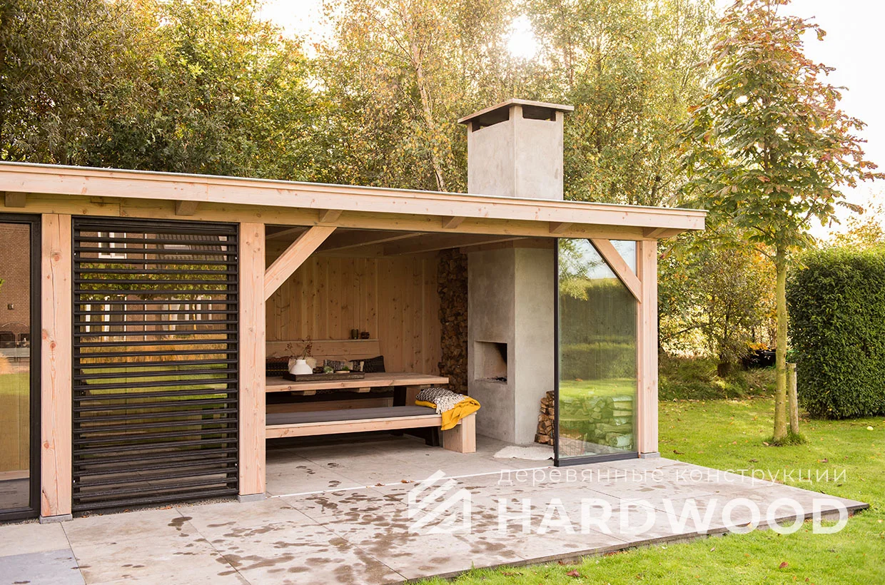 Определитесь с конструкцией и материалами. Для силуэта лофт характерны односкатные или плоские кровли, контраст дерева и металла, минималистичная обрешётка. Если важен всесезонный комфорт — подумайте о частичном остеклении, ветрозащите и подсветке; для летнего формата достаточно открытого павильона с навесом.